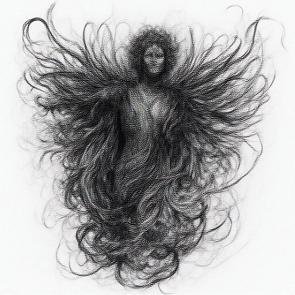 Mystical shadowy figure, celestial-winged woman, ink-drawn elegance, ethereal presence, interwoven between light and dark realms, intricate details and swirling patterns, hauntingly beautiful and mysterious aura, timeless beauty captured in pen, merging fantasy and reality.