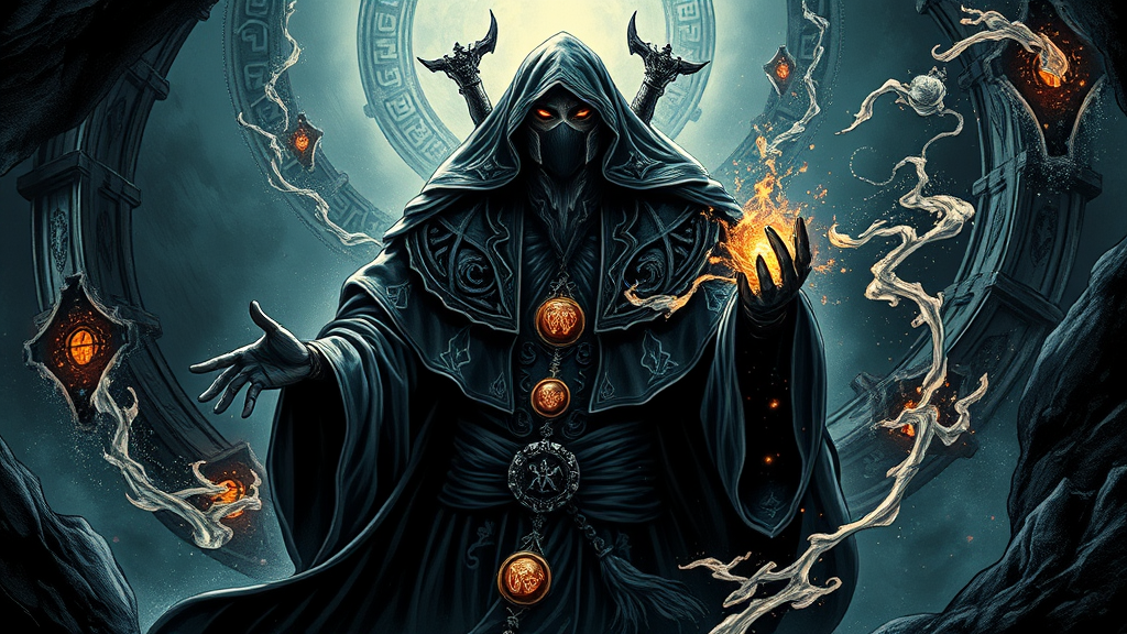 Mystical sorcerer inspired by a black mage from final fantasy, rendered in an intricate final fantasy ink style, illuminated by dramatic lighting that casts deep shadows, captured in a wide angle perspective, 4k resolution, set in a fantastical, enchanted landscape with swirling magical energy and ancient runes, the sorcerer’s robes adorned with shimmering symbols, eyes glowing with arcane power, atmosphere charged with mystery and allure.