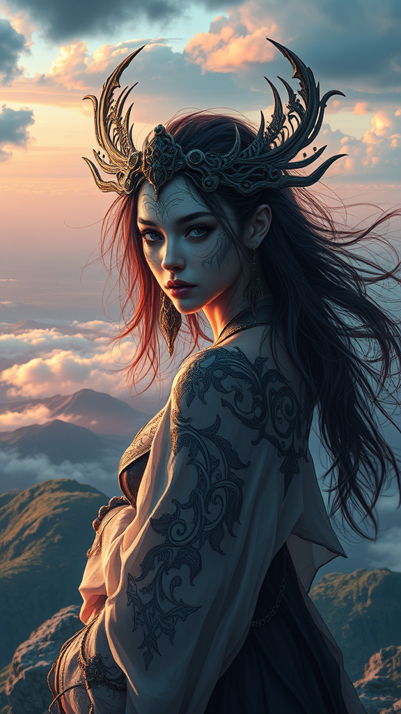 Mystical sorceress| poised on solitary hilltop| centered in frame| exquisitely detailed face| anime-inspired artistry| key visual focus| complex intricacies| stunningly detailed| awe-inspiring| vivid colors| sweeping panoramic view| cinematic atmosphere| echoing Carne Griffiths’s ethereal style and Conrad Roset’s emotive elegance.