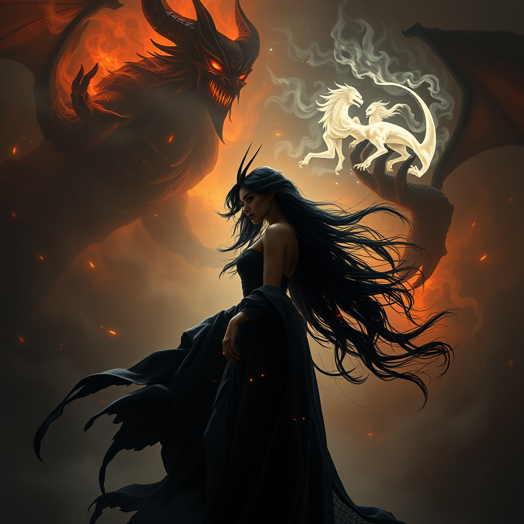 Mystical sorceress with flowing ebony hair stands defiantly before a menacing demon, enshrouded in ethereal mist; fantasy artwork capturing the essence of an epic card game; her figure composed of dancing shadows and flickering black flames; side profile of a dark enchantress; intense and dynamic lighting illuminates her presence in striking detail; UHD 4k quality; atmospheric and captivating scene.