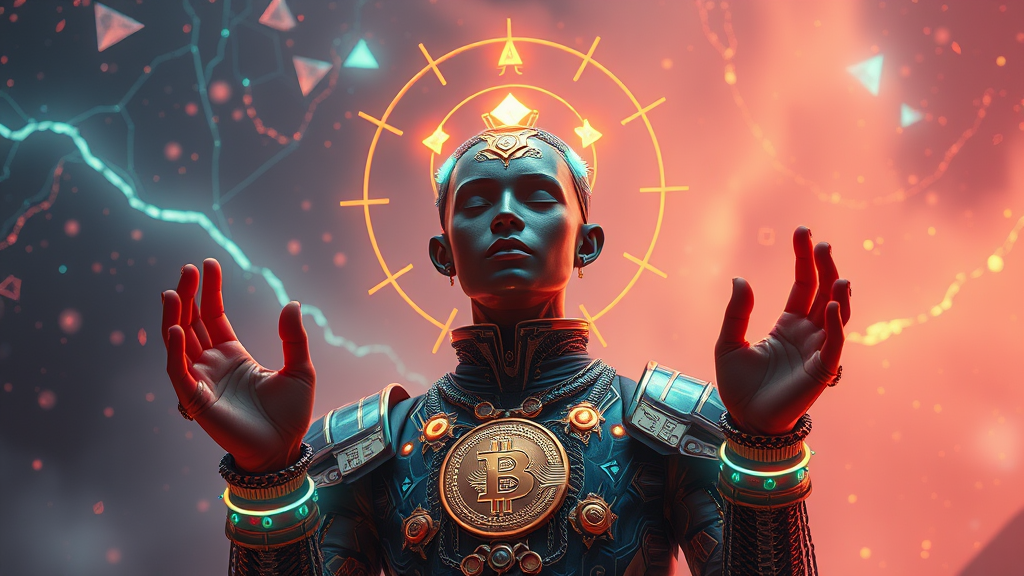 Mystical tech sages, cybernetic spirituality, avant-garde cryptocurrency fashion, hyper-realistic visuals, futuristic bitcoin-infused attire, technological enlightenment vibes, digital age aesthetics.