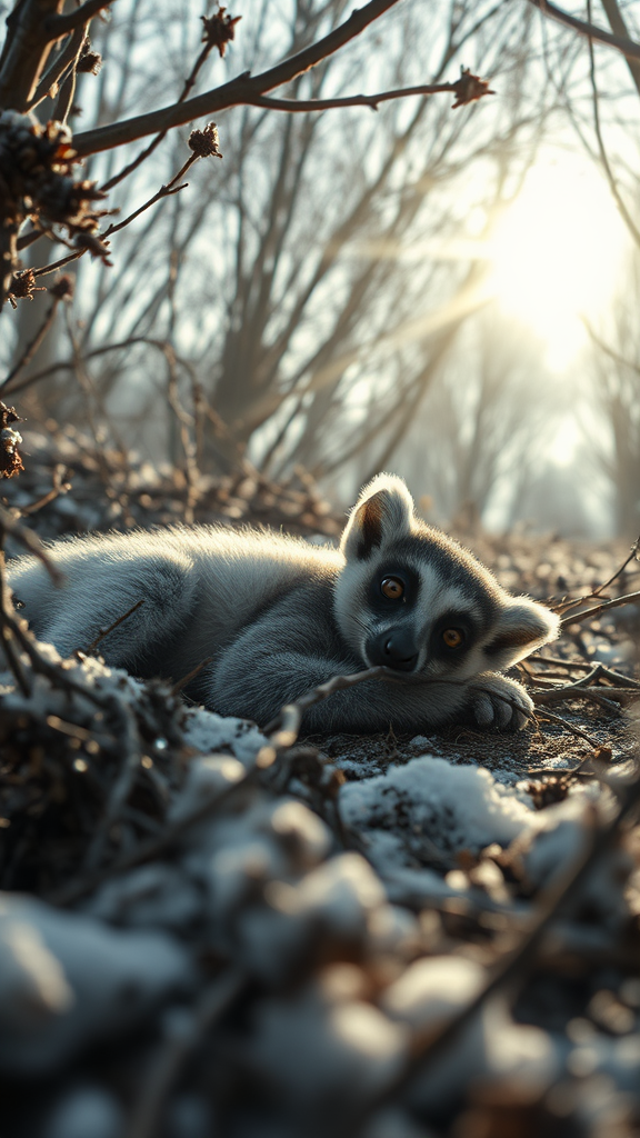 Mystifying undergrowth perspective of a carpet Lemur, sprawling across winter's barren landscape, amidst bio-mechanical foliage in a stark color palette reminiscent of Franklin Giger's biomechanoid visions and Leclerc's industrial harvesting majesty, captured in hyper-realistic 8K resolution with Nuke 9-percept deep negative tone mapping of every detail as rays of pale winter sun bask upon the creature's pale fur.