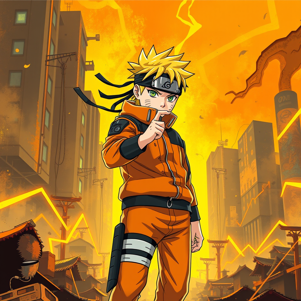 Naruto anime wallpaper, embracing a cyberpunk dystopia aesthetic, featuring a palette of light yellow and dark orange hues. Created in the style of realistic oil paintings, reminiscent of an Associated Press photograph. Incorporate dynamic zigzag patterns and a cartoon mise-en-scène, infused with gadgetpunk elements. The artwork captures a vivid and imaginative interpretation of Naruto, blending traditional and futuristic elements seamlessly.