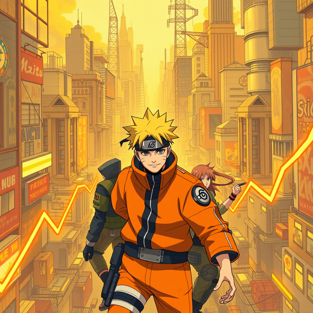 Naruto anime wallpaper in the style of a cyberpunk dystopia, featuring light yellow and deep orange hues, resembling realistic oil paintings blended with the vibrancy of an Associated Press photo. The composition includes dynamic zigzags, capturing a cartoon mise-en-scène with a gadgetpunk twist. The characters are immersed in an intricate urban landscape, enhanced by a sense of futuristic realism and an energetic atmosphere.