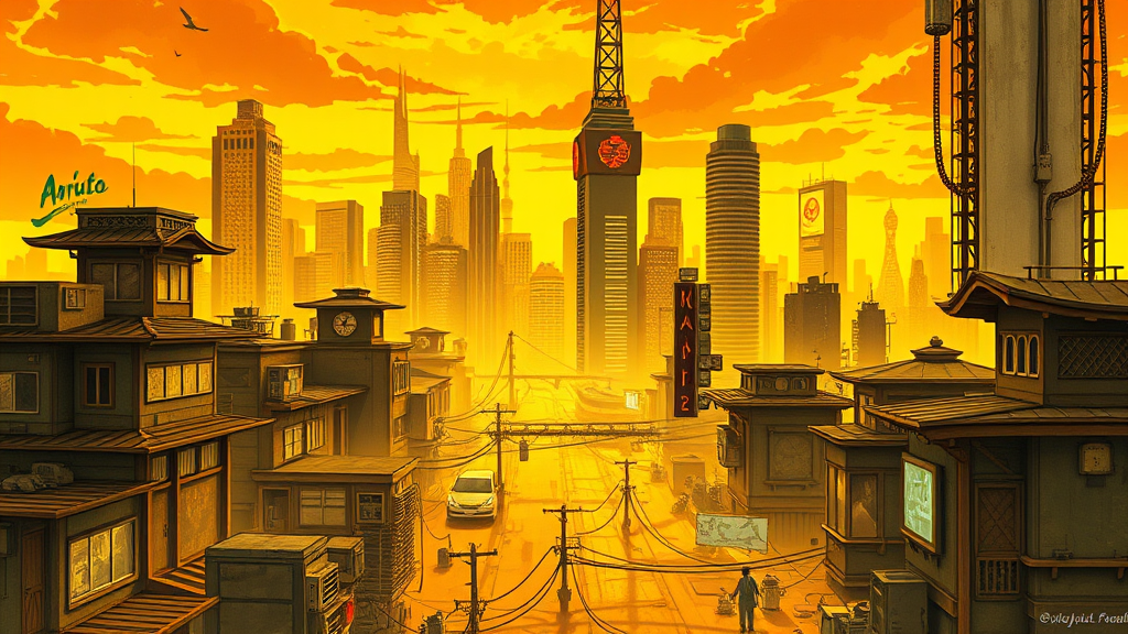 Naruto anime wallpaper in the style of a cyberpunk dystopia featuring light yellow and dark orange hues, resembling realistic oil paintings, reminiscent of an Associated Press photo. Incorporates zigzag patterns and a cartoon mise-en-scène with a gadgetpunk twist, depicting a futuristic world where traditional shinobi elements merge with advanced technology, set against a vibrant urban skyline.