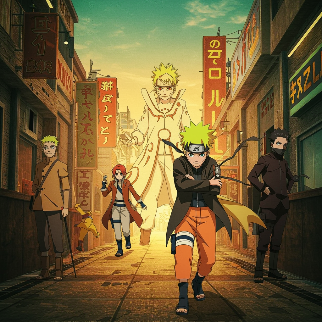 Naruto anime wallpaper, infused with a cyberpunk dystopia vibe, featuring a palette of light yellow and dark orange. The scene mimics realistic oil paintings combined with the cinematic quality of an Associated Press photo. Design elements include dynamic zigzags and a cartoonish mise-en-scène, set in a gadgetpunk world.