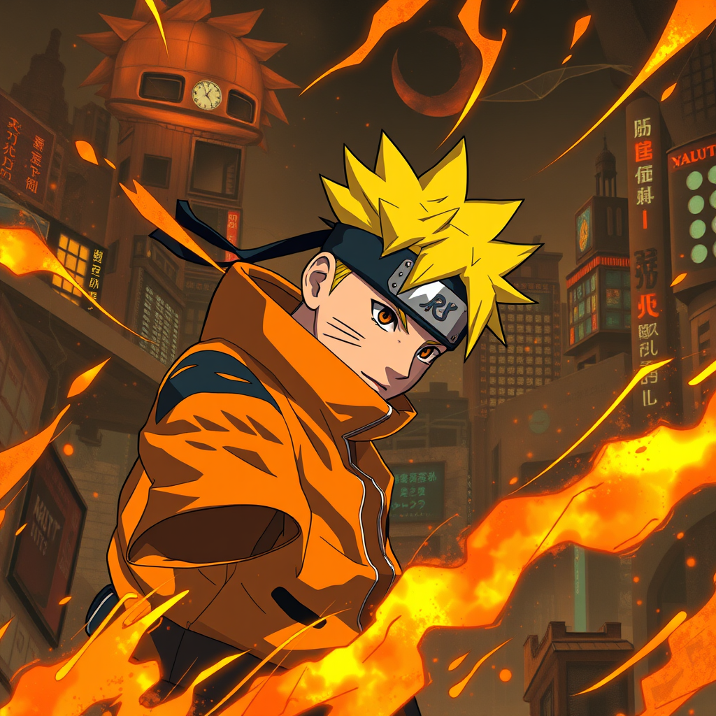 Naruto anime wallpaper, infused with cyberpunk dystopia vibes, featuring light yellow and dark orange hues. Designed in the style of realistic oil paintings with elements of an associated press photo aesthetic. Incorporates zigzag patterns and a cartoon mise-en-scène with a gadgetpunk twist, capturing a dynamic and futuristic Naruto world.