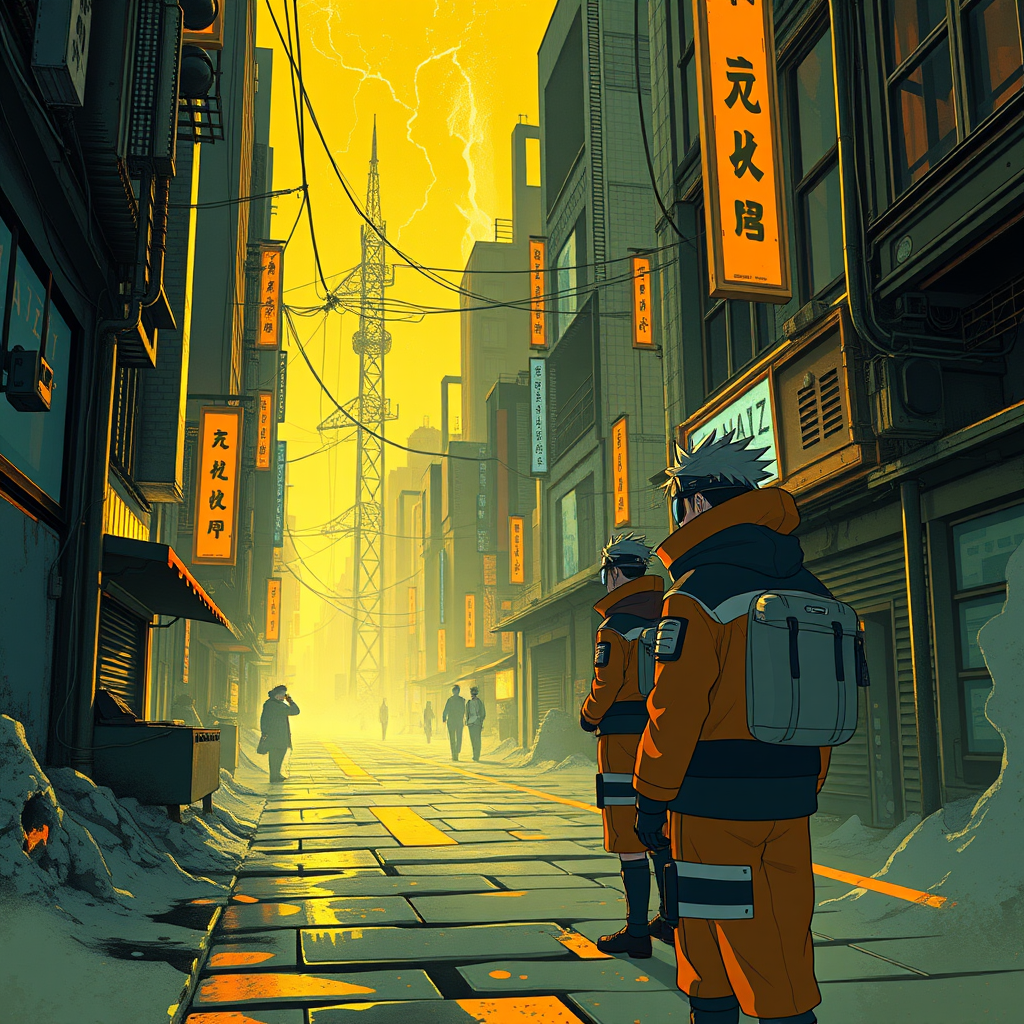 Naruto anime wallpaper, inspired by cyberpunk dystopia, focuses on a light yellow and dark orange palette. The scene captures a realistic oil painting style, reminiscent of an Associated Press photo, while incorporating zigzag patterns. The composition showcases a cartoon mise-en-scène with a gadgetpunk twist, blending futuristic technology with traditional Naruto elements. The vertical artwork features shadowy cityscapes and neon accents, highlighting the surreal contrast between the vibrant characters and their urban environment, set in a 9:16 aspect ratio with niji 5 influence.