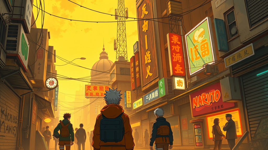 Naruto anime wallpaper inspired by cyberpunk dystopia combines light yellow and dark orange hues, featuring realistic oil painting textures with an associated press photo aesthetic. The scene includes zigzag patterns and a gadgetpunk vibe, set in a cartoon mis-en-scene. The artwork captures a futuristic cityscape with Naruto characters, blending traditional elements with advanced technology, emphasizing urban chaos and vibrant neon lights amidst shadowed alleyways.