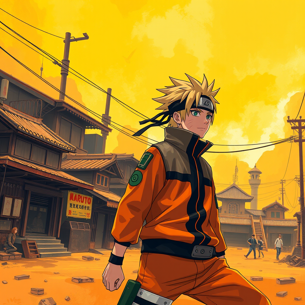 naruto anime wallpaper, naruto wallpaper, in the style of cyberpunk dystopia, featuring light yellow and dark orange hues, rendered as realistic oil paintings, with the aesthetic of an associated press photo. Incorporate zigzag patterns and a cartoon mise-en-scène, inspired by gadgetpunk elements. Capture a dynamic and immersive atmosphere, blending traditional Naruto motifs with a futuristic twist.
