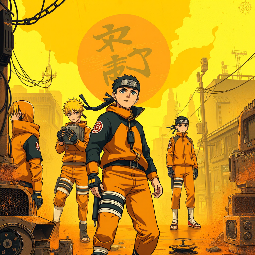 Naruto-inspired anime wallpaper set in a cyberpunk dystopian world, featuring a palette of light yellow and dark orange, illustrated in a style reminiscent of realistic oil paintings. The scene captures the gritty, high-tech essence of an Associated Press photo, infused with zigzag patterns and cartoonish mis-en-scene elements. Elements of gadgetpunk technology are woven throughout, enhancing the futuristic setting, bringing to life Naruto's world with an imaginative twist. Characters are depicted in dynamic poses, seamlessly blending traditional ninja aesthetics with advanced cybernetic enhancements in a striking vertical composition.
