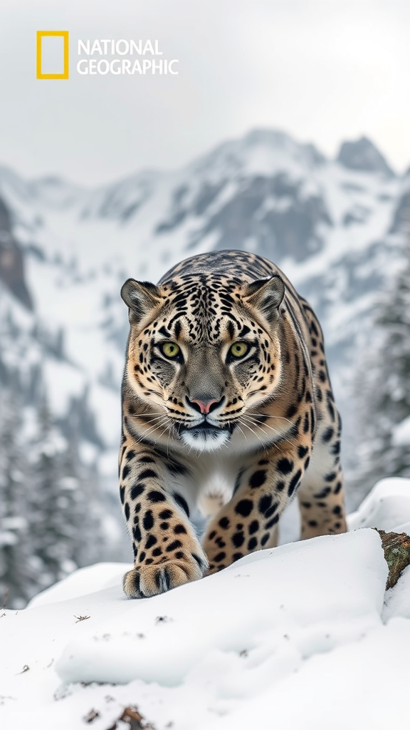 National Geographic award-winning photograph of a prowling snow leopard in a snowy alpine forest, surrounded by rugged, snow-covered terrain under an overcast sky, showcasing the entire body in exquisite detail and high resolution. The snow leopard locks eyes with the camera, exuding a piercing, predatory gaze, its eyes rendered with hyper-detail. The image captures the animal in sharp focus, bathed in the soft, natural light of the mountainous environment, highlighting its stealth and majesty with exceptional clarity.