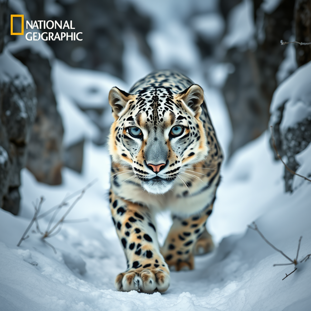National Geographic award-winning wildlife photo capturing a majestic snow leopard stealthily moving through a snow-covered rocky mountain forest. It's a cloudy day, and the scene is bathed in natural, subdued lighting, highlighting the leopard's full body in exquisite, high-resolution detail. The snow leopard locks eyes with the viewer, giving an intense, predatory gaze. The eyes are exceptionally detailed, bringing a striking focus to its fierce expression. The entire image is crisp and clear, emphasizing the intricate textures of both the animal's fur and the surrounding snowy landscape.