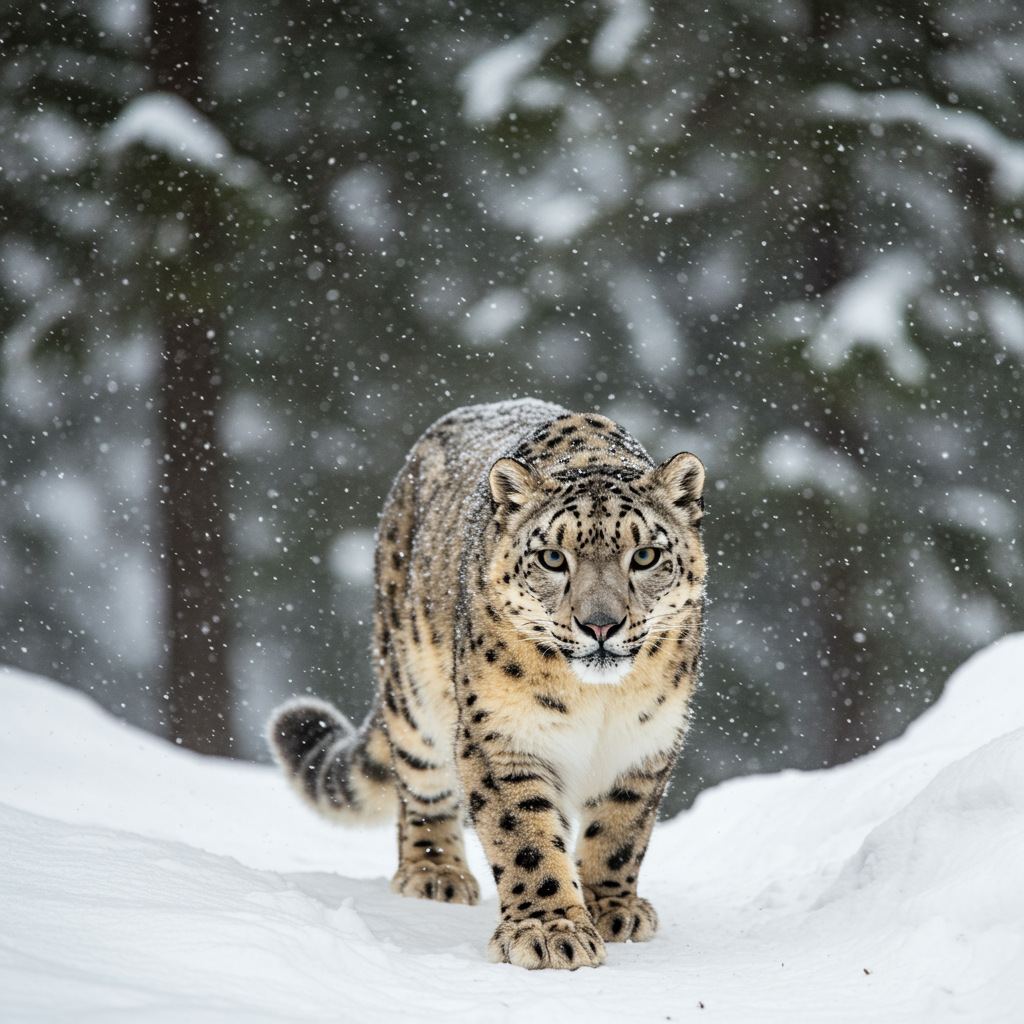 National Geographic award-winning wildlife photo depicting a stalking snow leopard in a snowy mountain forest on an overcast day; the landscape is blanketed with snow, showcasing the leopard in full-body view with intricate detail and high resolution. The leopard fixes an intense, predatory gaze at the viewer with hyper-detailed eyes, captured in crisp focus under the ethereal natural lighting of the scene. The composition presents a harmonious blend of rugged terrain and serene snowfall, evoking the raw beauty and stealth of the elusive predator in its natural habitat.