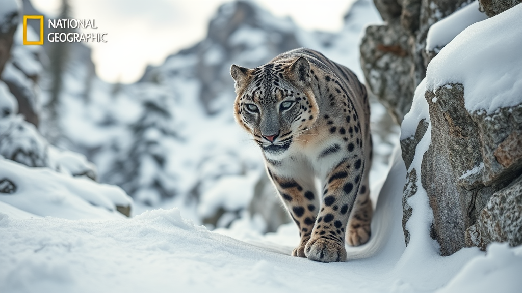 National Geographic award winning wildlife photograph capturing a snow leopard stealthily navigating a snow-draped rocky mountain forest on a cloudy day, its full body expertly framed in a crisp and high-resolution image. The snow leopard's intense gaze penetrates the camera, conveying its predatory instincts, highlighted by hyper-detailed eyes. The scene is a masterpiece of natural lighting, with each element in sharp focus, showcasing the intricate beauty of its fur and the surrounding snow-covered landscape. Subtle changes in perspective offer a slightly elevated viewpoint, enhancing the majestic aura of this elusive predator.