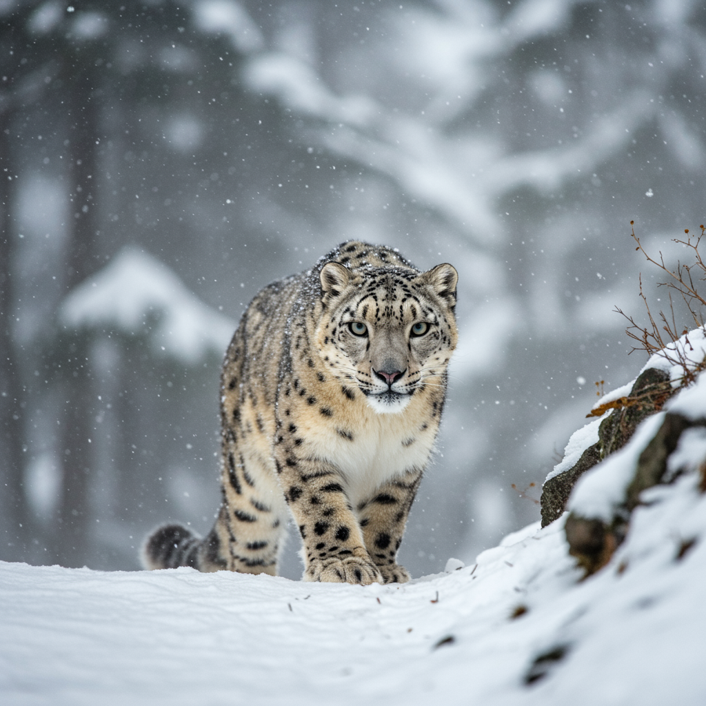 National Geographic award-winning wildlife shot featuring a stealthy snow leopard prowling through a snowy, rugged mountain forest on a mist-laden day, entire body visible, exquisitely detailed in high resolution. Its piercing eyes lock onto the viewer with a captivating intensity, embodying a hunter's focus. The scene is captured in stunning clarity and bright natural lighting, highlighting the intricate patterns of its fur and the serene, snow-draped landscape that surrounds it.
