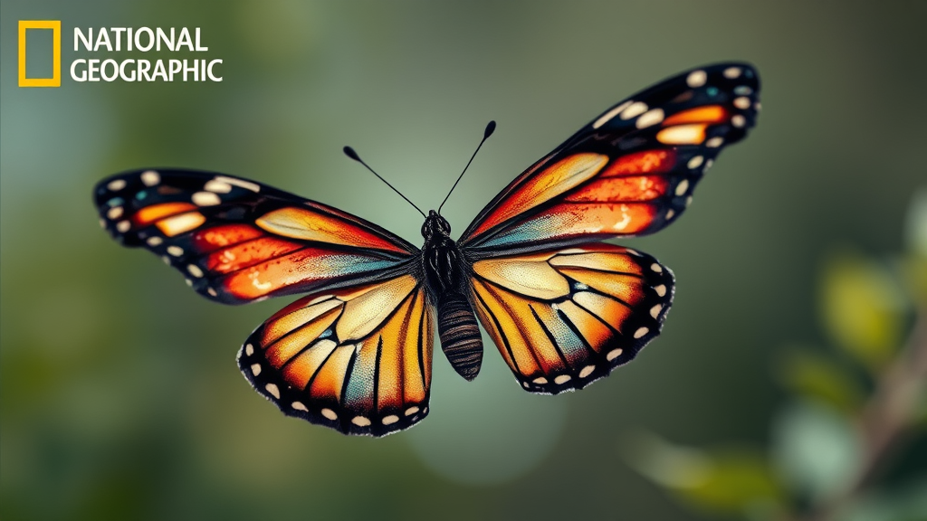 National Geographic-inspired image of a butterfly in mid-flight, captured in a close-up, showcasing ultra-realistic and highly detailed features, vibrant colors and intricate wing patterns, set against a soft-focused natural background, conveying a sense of delicate motion and awe-inspiring beauty.