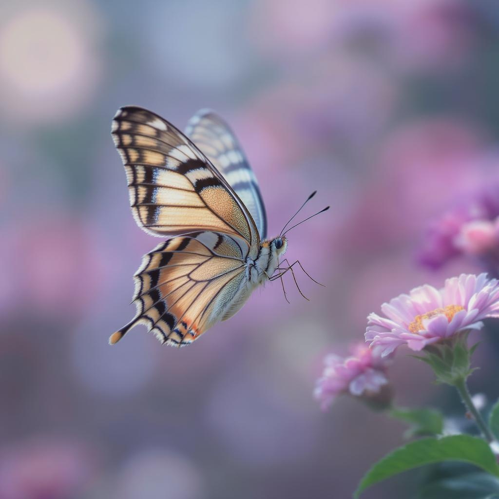 A stunning National Geographic-style image captures an ultra-realistic close-up of a butterfly gracefully in mid-flight. The intricate details of the wings showcase vibrant patterns and textures, highlighted by the soft glow of natural light. The background fades gently into a dreamy blur, enhancing the focus on the delicate beauty and dynamic motion of the butterfly in its natural environment. The composition exudes an ethereal quality, emphasizing the delicate balance of nature's artistry.