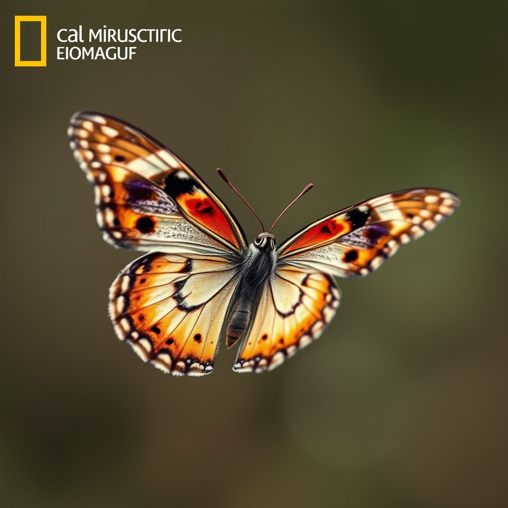 National geographic style photograph capturing a butterfly in mid-flight, focusing on a close-up view showcasing its vibrant wings, intricately detailed patterns, and delicate textures in an ultra-realistic manner, incorporating natural lighting and a softly blurred background with slight artistic enhancements for dramatic effect.
