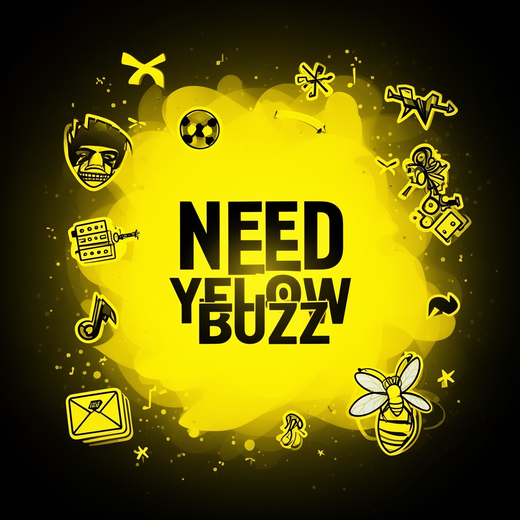 A vibrant yellow cloud with the bold text 'NEED YELLOW BUZZ' is surrounded by playful black and yellow doodle icons. The artwork features a mix of abstract shapes, a bee, musical notes, and other whimsical elements, creating an energetic and eye-catching design.