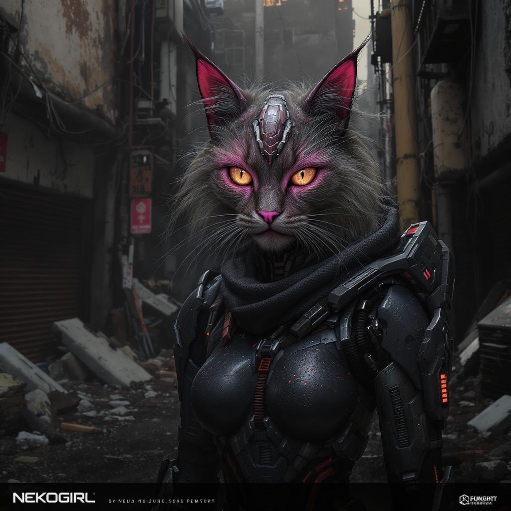 Nekogirl in a gritty sci-fi world, blending Neill Blomkamp's style with the raw aesthetic of District 9, captured through the expansive lens of Cinemascope, featuring vibrant urban decay juxtaposed with the otherworldly charm of catlike features, veiled in mystery and technological intrigue.
