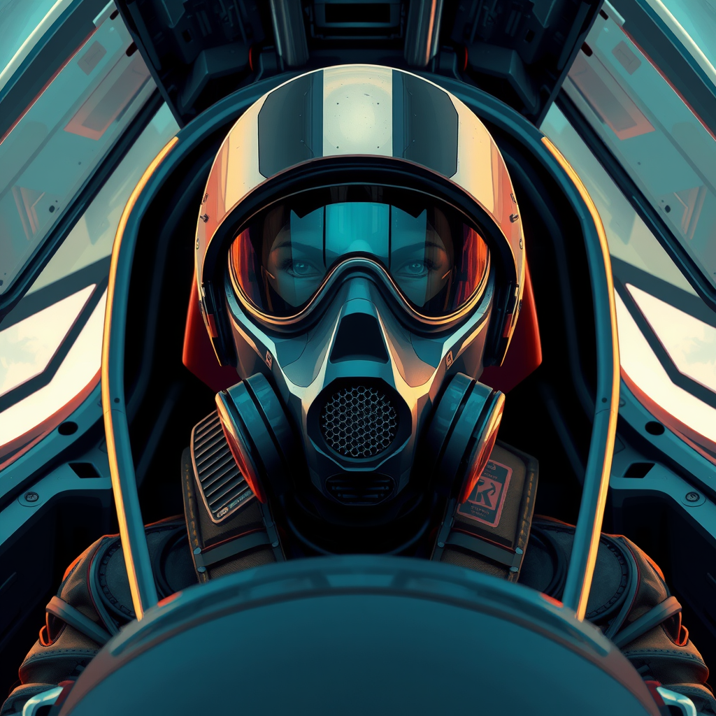 Neofuturistic highly detailed portrait illustration of an individual in a gas mask seated in the cockpit of an advanced fighter jet, futuristic visor complementing the mask conveying a sense of cutting-edge technology, 4K symmetrical portrait exhibiting subtle creative alterations maintaining the essence of the original concept.