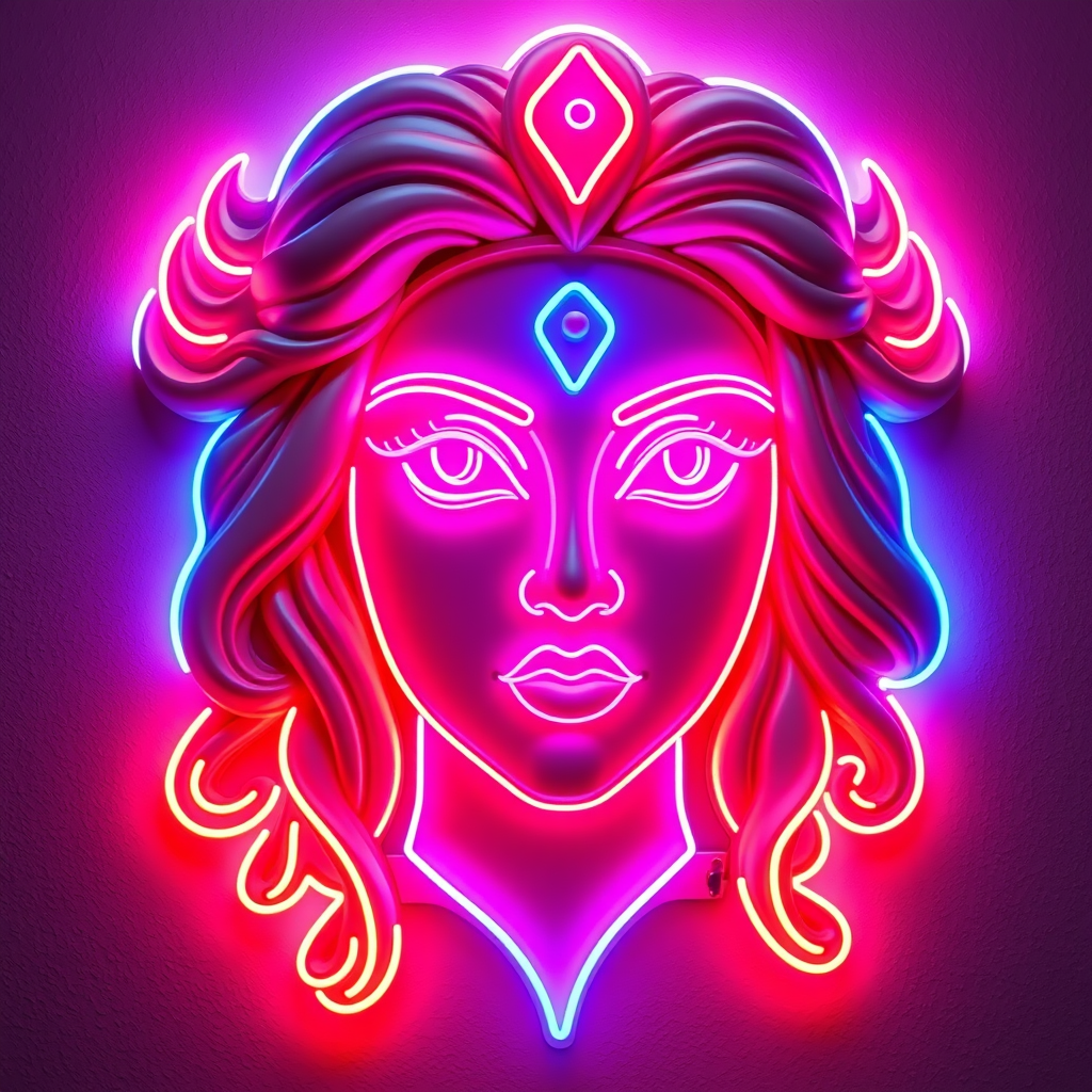 Neon light sign crafted in the shape of a stunning goddess's face, showcasing a detailed and beautiful visage with precise linework; intricate and realistic design; studio-quality finish with a cinematic glow; luminescent character design; highly detailed concept art; vibrant digital illustration; rendered with vray finesse, capturing the essence of ethereal beauty.