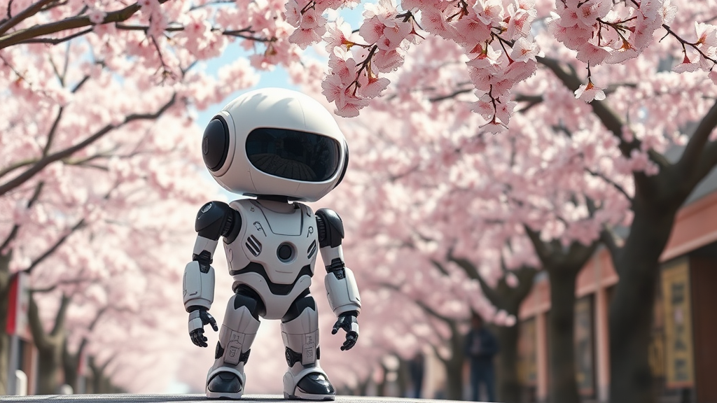 Nestled among the endless blossoms of cherry trees on Sakura Street in Japan, a charming little Tachikoma robot from the beloved anime 'Ghost in the Shell' stands, as captivating as a sakura in full bloom.