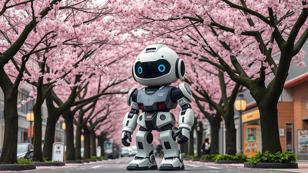 Nestled amongst the vibrant cherry blossom trees lining Sakura Street in Japan, a charming Tachikoma robot, reminiscent of the beloved anime 'Ghost in the Shell', stands proudly, its presence as captivating as the petals of sakura dancing in the breeze.