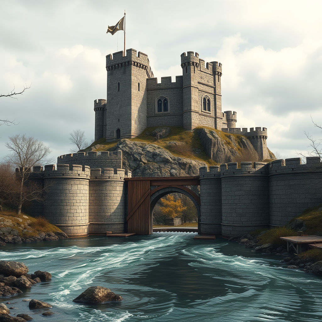 Nestled atop a craggy hill, the medieval castle loomed, its towering stone walls rising majestically against the horizon, guarded by a briskly flowing moat that mirrored the steel-gray sky above. The stout drawbridge, a formidable barrier of oaken timbers, lay raised, its chains clinking softly in the stiff breeze that carried the distant echo of an impending clash. Knights clad in gleaming armor patrolled the ramparts, their visors glinting under a pallid sun, while archers stood vigilant, bows strung and arrows nocked, eyes scanning the landscape for any sign of a rival banner. The courtyard buzzed with activity; blacksmiths hammered out a relentless rhythm on their anvils, and pages scurried about with messages and provisions. Against this backdrop of impending war, the castle stood resolute, a bastion of medieval life and a symbol of unwavering defiance.