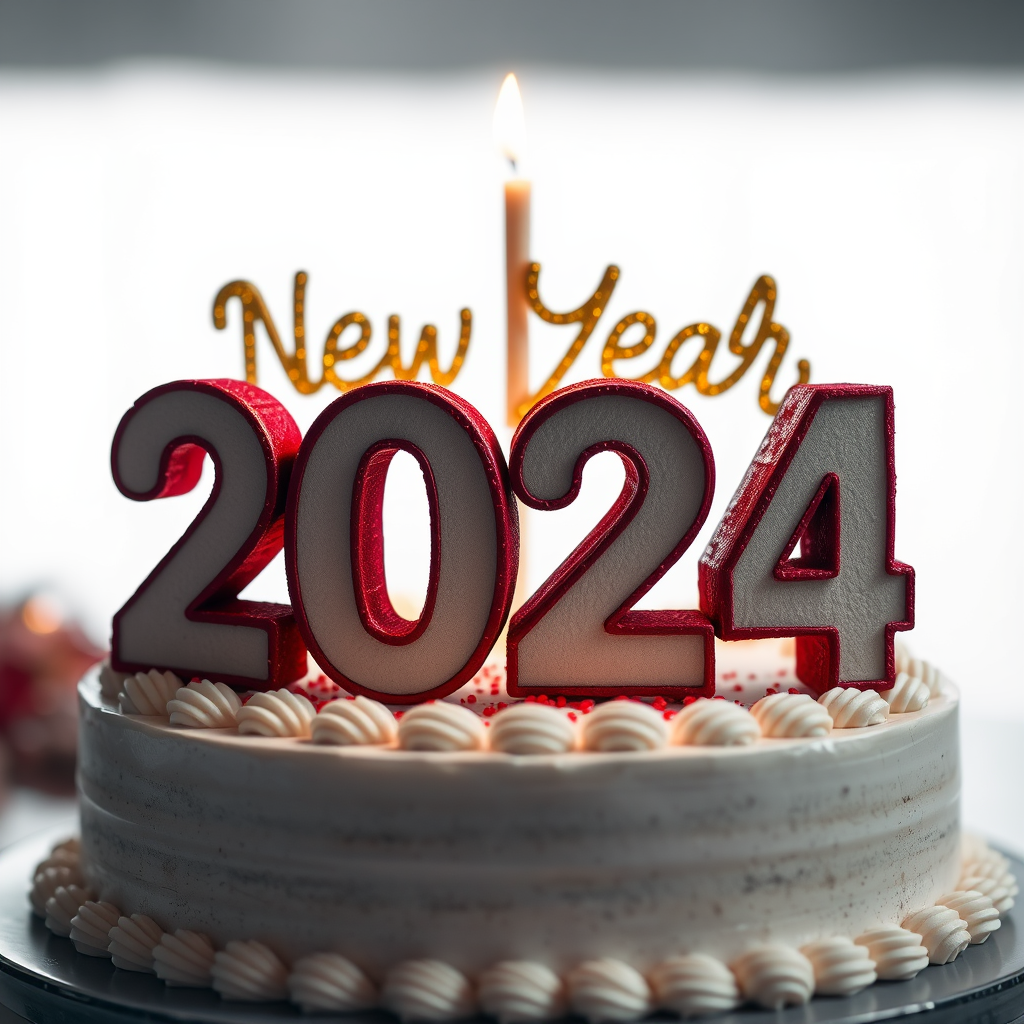 New Year's 2024 celebration cake, close-up portrait, ultra-realistic, captured with a 50mm lens, natural lighting setting, Canon SL3 DSLR, pristine white backdrop, unparalleled quality, top-tier graphics, ultra high-resolution imagery, astonishing clarity, cinematic frame, digital artistry, meticulously detailed, 8k and 4k high-definition, dynamic and vibrant lighting, intricate craftsmanship, 32K quality, flawless composition, festive and elegant ambiance, touches of creativity, subtle enhancements.