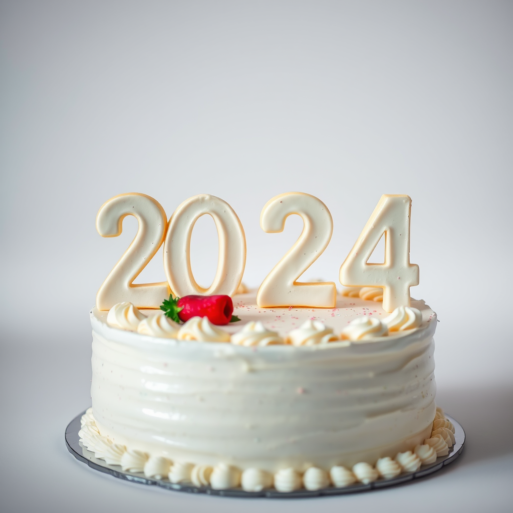 New Year's cake 2024, close-up portrait, ultra-realistic, standard lens 50mm-85mm, soft natural lighting, Canon SL3 DSLR, pristine white backdrop, superior high-definition quality, premium resolution, striking cinematic still, digital artistry, exceptionally detailed, 8K HD, 4K HD, vibrant dynamic lighting, exquisite details, 32K HD clarity, flawless composition, gentle creative enhancements.