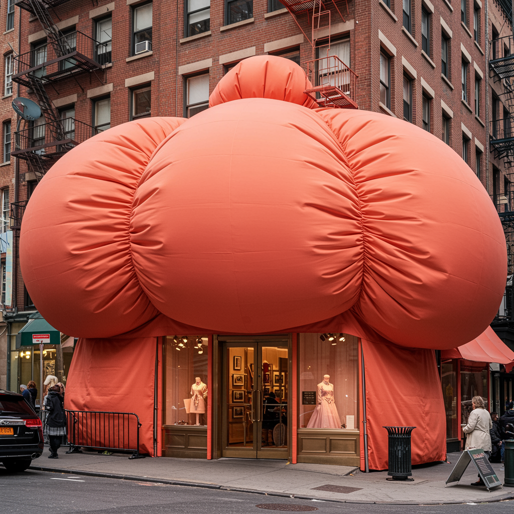 New York, city street scene, the facade of a chic boutique enveloped in an oversized coral silk fabric, extravagantly puffy and whimsically disproportionate, capturing even the tiniest details in a vibrant, photo-realistic, and high-quality depiction.