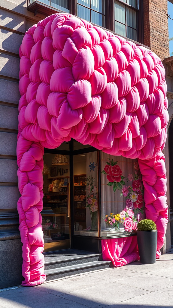 New York city street, the front of a boutique is draped in an oversized, puffy pink velvet fabric, extravagantly out of proportion. Every tiny detail pops, creating an insanely detailed, high-quality image. Shadows dance on the undulating surface, while sunlight reflects softly, casting a luxurious sheen. Brightly colored flowers and intricate embroidery adorn the fabric, adding an extra layer of opulence to this eye-catching facade.