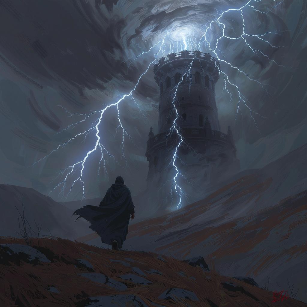 View this AI-generated image featuring an ominous night scene unfolds as a figure clad in black robes strides purposefully towards an ancient towering structure bathed in shadows lightning crackles across the stormy sky casting fleeting glimpses of the tower s imposing silhouette the scene evokes a