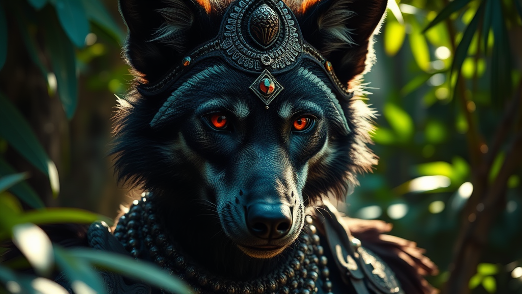 Night wolf adorned in intricate Mayan-inspired attire, captured up close, bathed in dappled sunlight filtering through dense jungle foliage, piercing red eyes and rugged facial scars add a fierce intensity, rendered in ultra-detailed 8k realism, showcasing stunning photorealistic textures and refined photography lighting, with expertly applied reflection mapping for a cinematic effect, maintaining a highly detailed and lifelike quality, portrait ratio 4:5, with a subtly mystical atmosphere enveloping the scene.