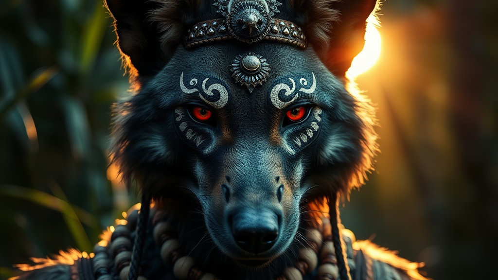 Night wolf adorned in Mayan tribal attire, captured up close with intense gaze, set against a sunlit jungle backdrop, with piercing red eyes and distinct facial scars, rendered in 8k ultra realistic imagery with photorealistic and cinematic photography lighting, enhanced by reflection mapping for ultra detailing, portraying the essence of the wild and ancient, with a mystical aura and subtle interplay of shadow and light over intricate patterns and textures, --ar 4:5 --q 2.