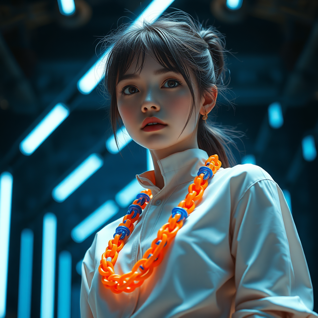 niji, octane render, close-up of a girl in Chic attire, designed by Hubert De Givenchy, with rolled-up sleeves and a unique Orange and Blue Body Chain. The scene is set in a Futurepunk fall with a backdrop of cathode tubes, capturing a sense of hope. The photograph exudes realism and photorealism, focusing on a low contrast, low poly aesthetic. It's a full body shot, portraying a spring-like atmosphere and an aura of optimism.