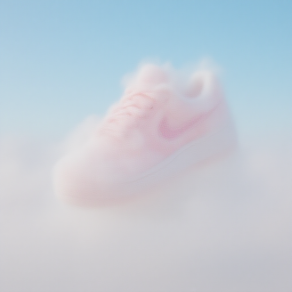 Nike cotton candy shoes floating on a fluffy cloud, 3D render, Nike logo subtly integrated, minimalist composition, vibrant and whimsical illustration envisioned by Midjourney Nfixer, delicate cotton candy texture paired with a dreamy sky background.