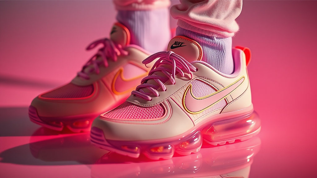 Nike emblem on the footwear, trainers featuring silicone bases, soft pastel hues, crafted by visionary designer Craig Green, illuminated in a high-fashion photoshoot, sharp detail, cinematic clarity, detailed futuristic elegance, stylish allure, symmetrical balance, suitable for a Vogue editorial or glossy magazine spread, capturing the essence of modern glamour.
