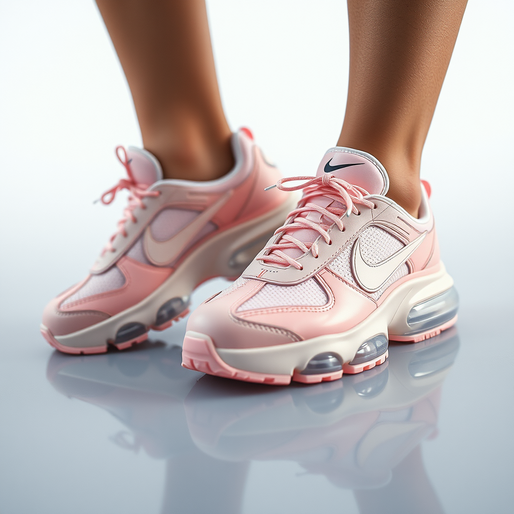 Nike emblem subtly integrated into the shoe design, sneakers featuring innovative silicone soles, adorned in a palette of soft pastel hues, captured in a fashion-forward photoshoot inspired by Craig Green's aesthetic; emphasizing sharp focus and intricate details. The overall style exudes a cinematic quality, blending elements of futurism with a touch of glamour. The composition is symmetrical and worthy of a Vogue editorial spread, showcasing the sneakers in a glossy, magazine-ready finish that highlights their avant-garde appeal.