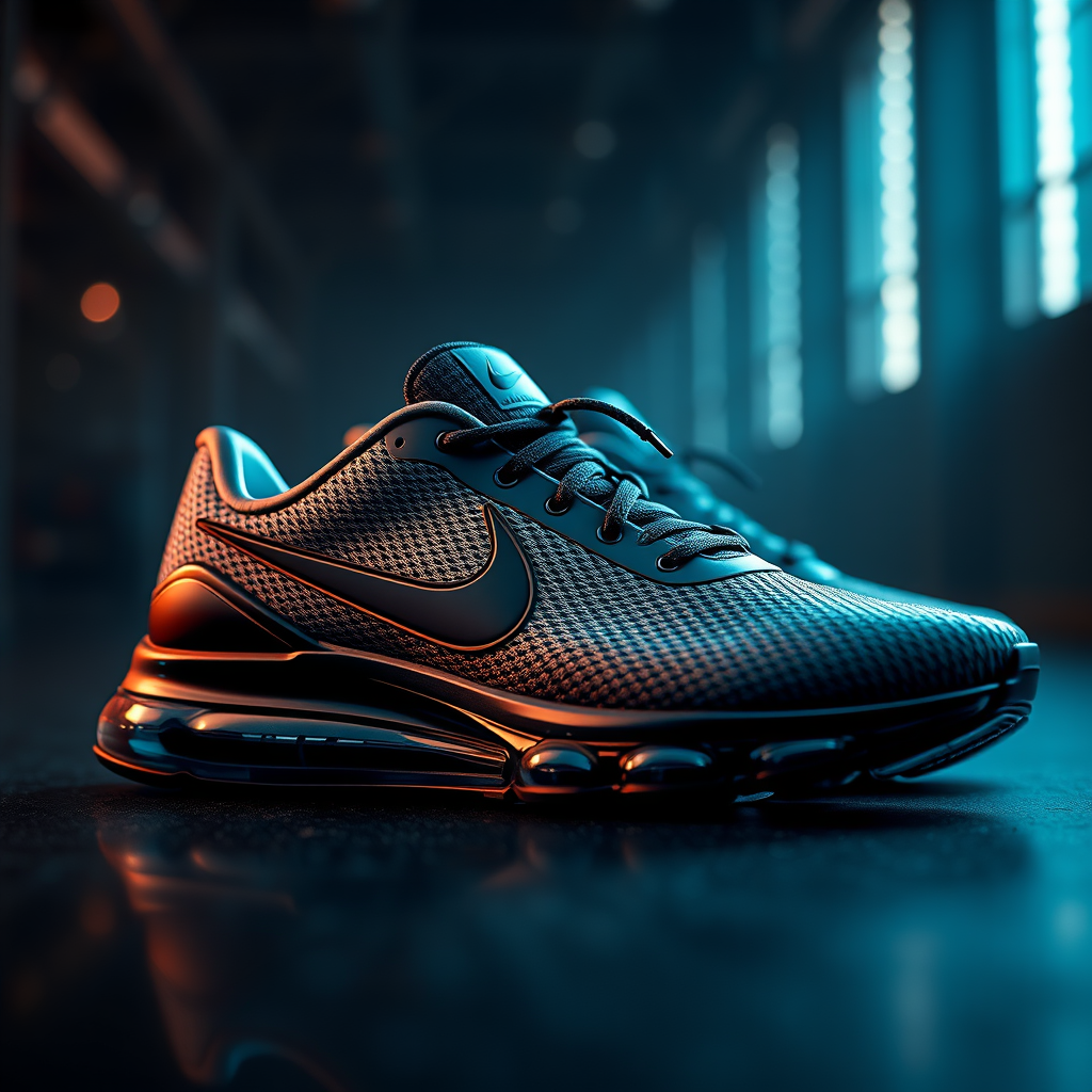 Nike performance sneakers crafted from advanced rubber and composite fibers, featuring an elegant black Nike logo embedded seamlessly into the design, captured through the lens of renowned photographer Steven Meisel. The scene is set with exquisite lighting, reminiscent of the dynamic visuals created in Unreal Engine and Octane Render. The composition boasts high-definition clarity and an IQ of 180, delivering stunning detail. The aspect ratio is 2:3, and the style exudes a futuristic yet classic aesthetic.