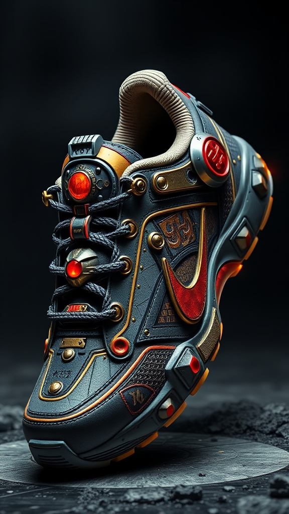 Nike sneaker design inspired by Warhammer 40,000 Space Marine, featuring intricately detailed armor patterns, metallic elements, vibrant chapter colors, futuristic aesthetics, ultra-high resolution, reminiscent of power armor's durability and combat-readiness, enhanced textures with 8k clarity, distinctive emblems and insignia, aerodynamic design with a robust structure, merging sci-fi and contemporary style elements.
