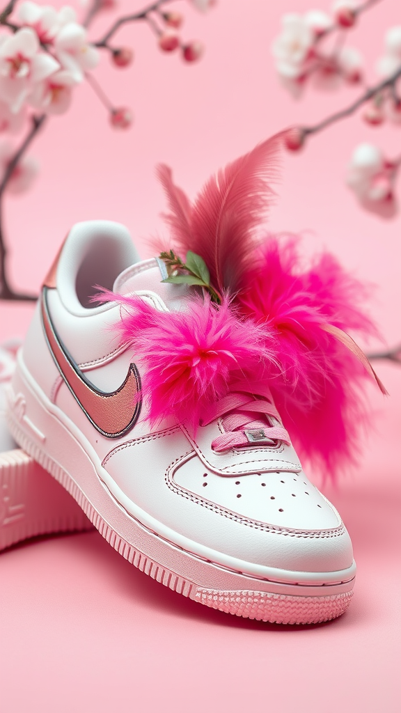 Nike sneakers adorned with elegant feather details and a playful boa, showcasing pure and vibrant tones against a soft cherry blossom theme, set on a delicate pink background, captured in a professional and polished photograph.