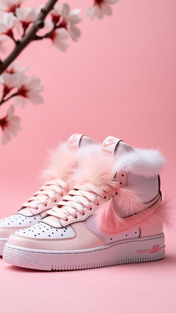 Nike sneakers adorned with delicate feathers and a soft boa embellishment, featuring a palette of pure, vibrant tones against a backdrop of cherry blossoms, all set against a subtle pink background in a professional, high-quality photograph.