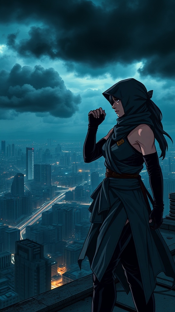 View this AI-generated image featuring a female ninja adorned with a subtle prompt hero emblem on her chest stands poised on a rooftop overlooking a sprawling dystopian cityscape shrouded in darkness the air is thick with tension as ominous storm clouds roll across the sky casting dramatic shadows o