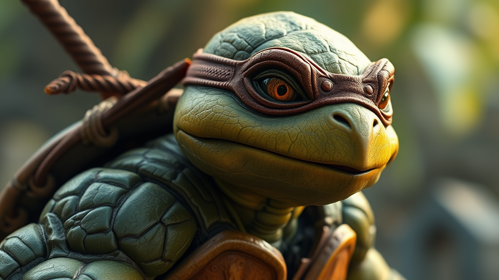 Ninja turtle in 8K ultra-realistic high-definition, showcasing intricate micro-details and an extraordinarily detailed shell structure, with lifelike textures and vivid colors, capturing every scale and wrinkle, dynamic and immersive setting that emphasizes the character's agile and stealthy nature.
