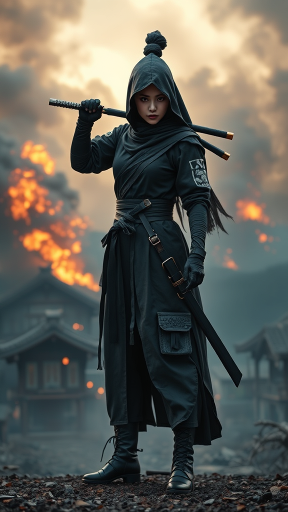 View this AI-generated image featuring a woman in an authentic ninja uniform stands poised against the backdrop of a burning village with smoke billowing behind her her full body form is centered as the key visual showcasing highly detailed features and breathtaking beauty in a realistic style volum