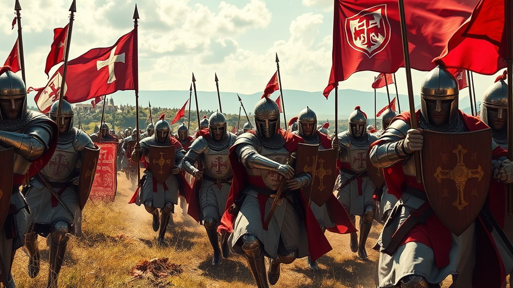 Noble knights of the Templar order charging fiercely into battle, their polished armor gleaming under the midday sun. The crimson and white Templar flag flutters boldly against a backdrop of medieval landscapes, circa 1150s. The environment is alive with the energy of a Christian crusade, infusing the scene with a sense of purpose and destiny. Mysterious symbols hint at hidden knowledge, echoing whispers of the Illuminati. The visual composition captures an epic, cinematic quality reminiscent of an Unreal Engine render, showcasing intricate armor details and battle-ready expressions of the knights, set in a dramatic portrait aspect ratio of 9:16.