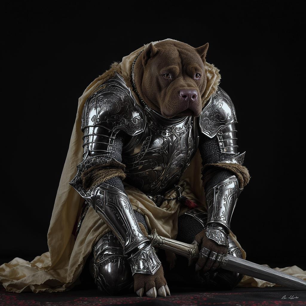 Noble pitbull knight, kneeling with grace, adorned in exquisitely detailed armor, featuring intricate silver designs interwoven with fine silk, captured in cinematic lighting, 4k resolution, aspect ratio 9:16.